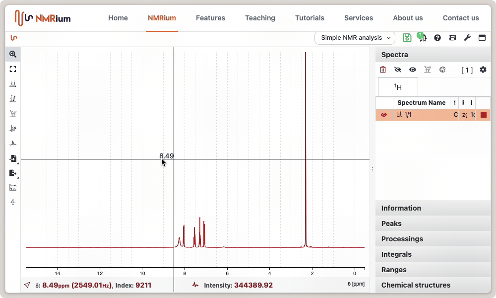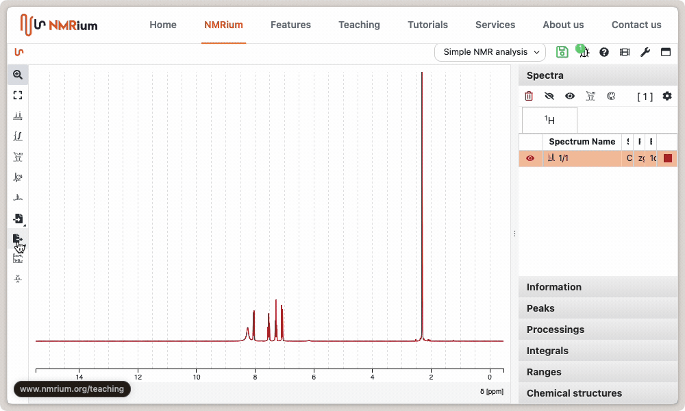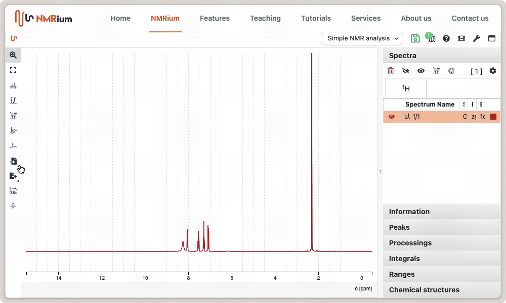 NMRium allows to save the analyzed spectra as images using either the PNG (Portable Network Graphics) format or the SVG (Scalable Vector Graphics). SVG is the best format for publications and can be further reprocessed using application like the free application Inkscape.