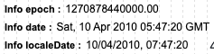 info.localeDate, the representation of the date based on your local preferencesinfo.date, the GMT dateinfo.epoch, the number of elapsed milliseconds since January 1, 1970