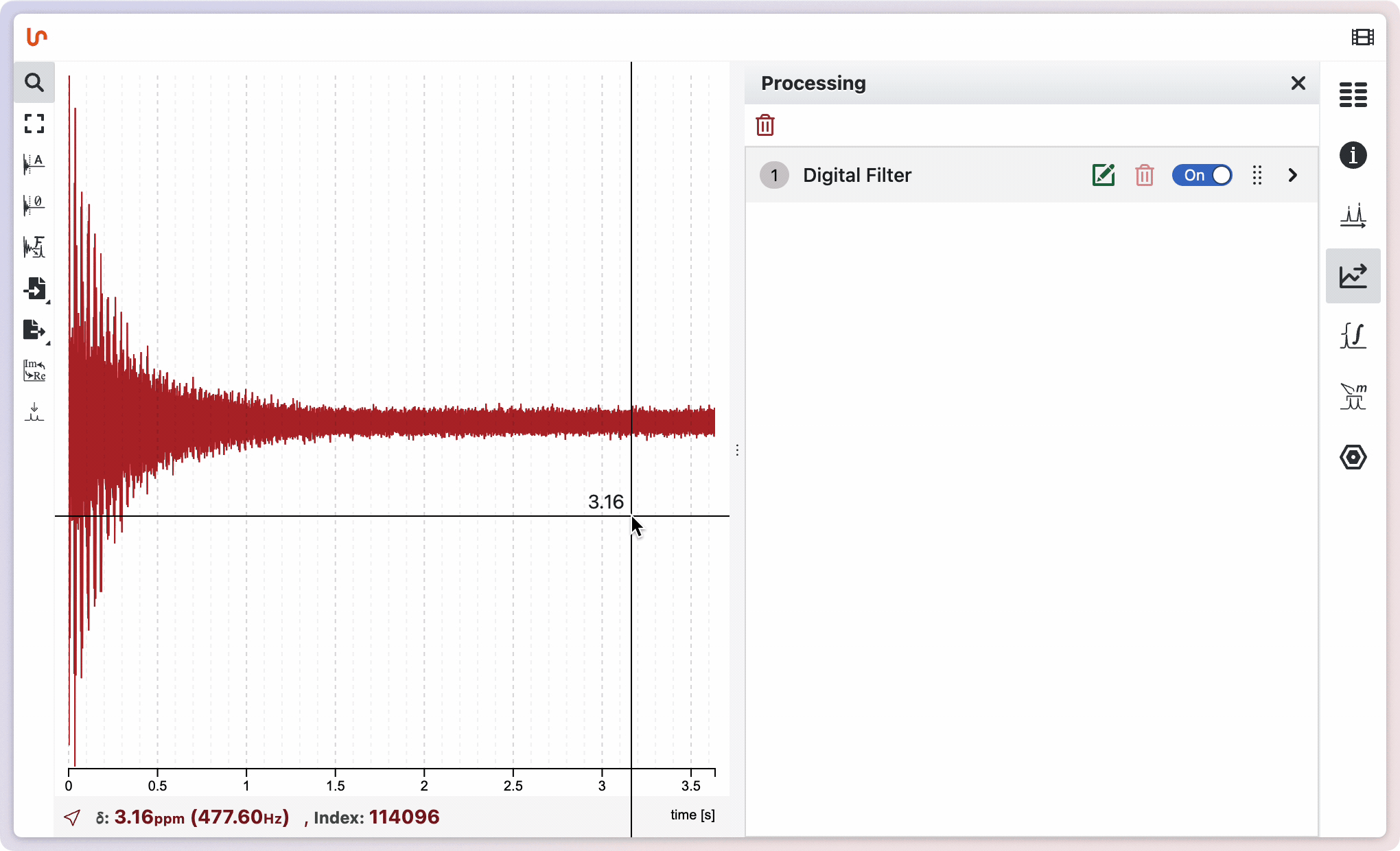 To perform apodization in NMRium, press the shortcut key a to open the Apodization / Window Functions Editor. By default, you’ll see an option at the top of the screen to set line broadening. A green line will display the apodization function that will be applied to the FID. You can choose to preview the processed FID by toggling the checkbox labeled Preview.