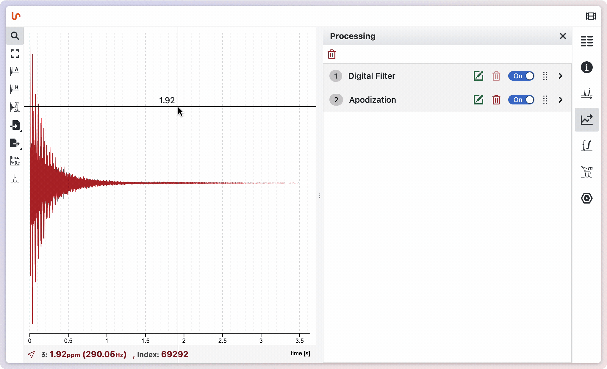 To prepare the FID for Fourier transformation using zero filling, click the Zero Filling button located to the left of the spectrum. You can specify the number of points to extend the FID size. Once configured, click Apply to perform zero filling.