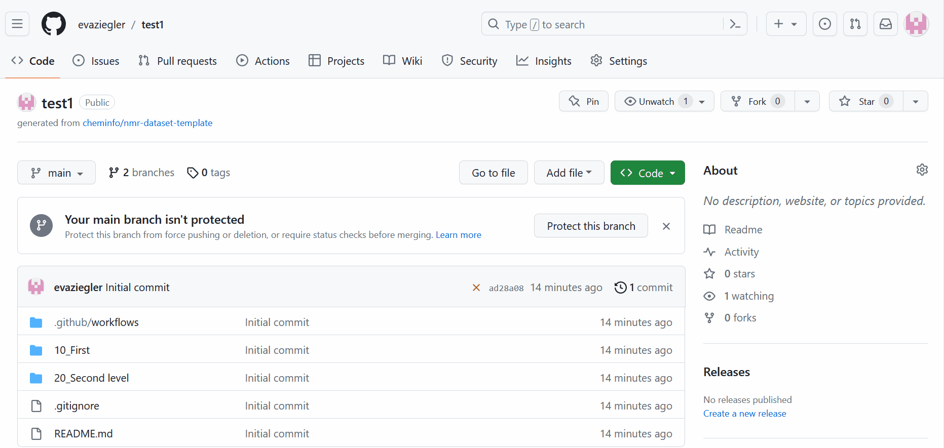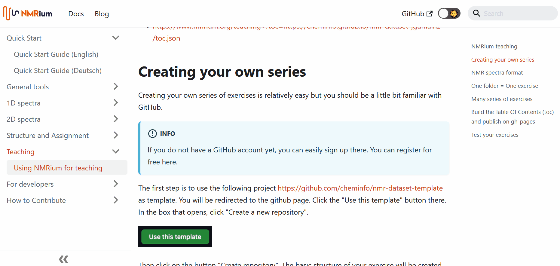 The first step is to use the following project https://github.com/cheminfo/nmr-dataset-template as template. You will be redirected to the github page. Click the "Use this template" button there. In the box that opens, click "Create a new repository".
